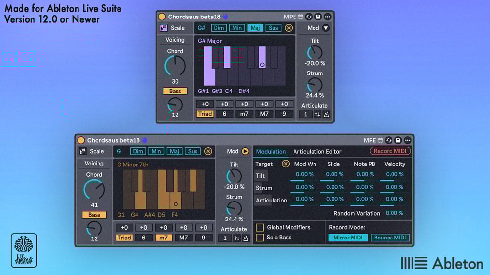 Chordsaus is my rendition of Orchid (ORC-300) by Telepathic Instruments, combined with elements of Ableton's Expressive Chords device.