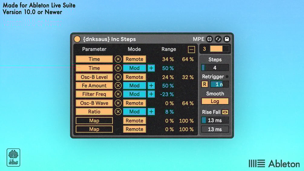 Inc Steps is a Modulator that triggers modulation steps to mapped parameters by incoming MIDI notes. Great for making swinging or back and forth rhythms on parameters other than midi grid placement.