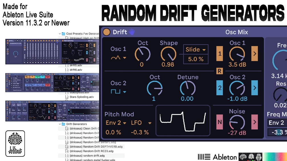 8 Variations of the Generator Rack, and 19 saved presets made from the racks. Centered around the newly added Drift synth in 11.3. The different generator patches have different mappings, parameter ranges, and effect racks for different vibes.